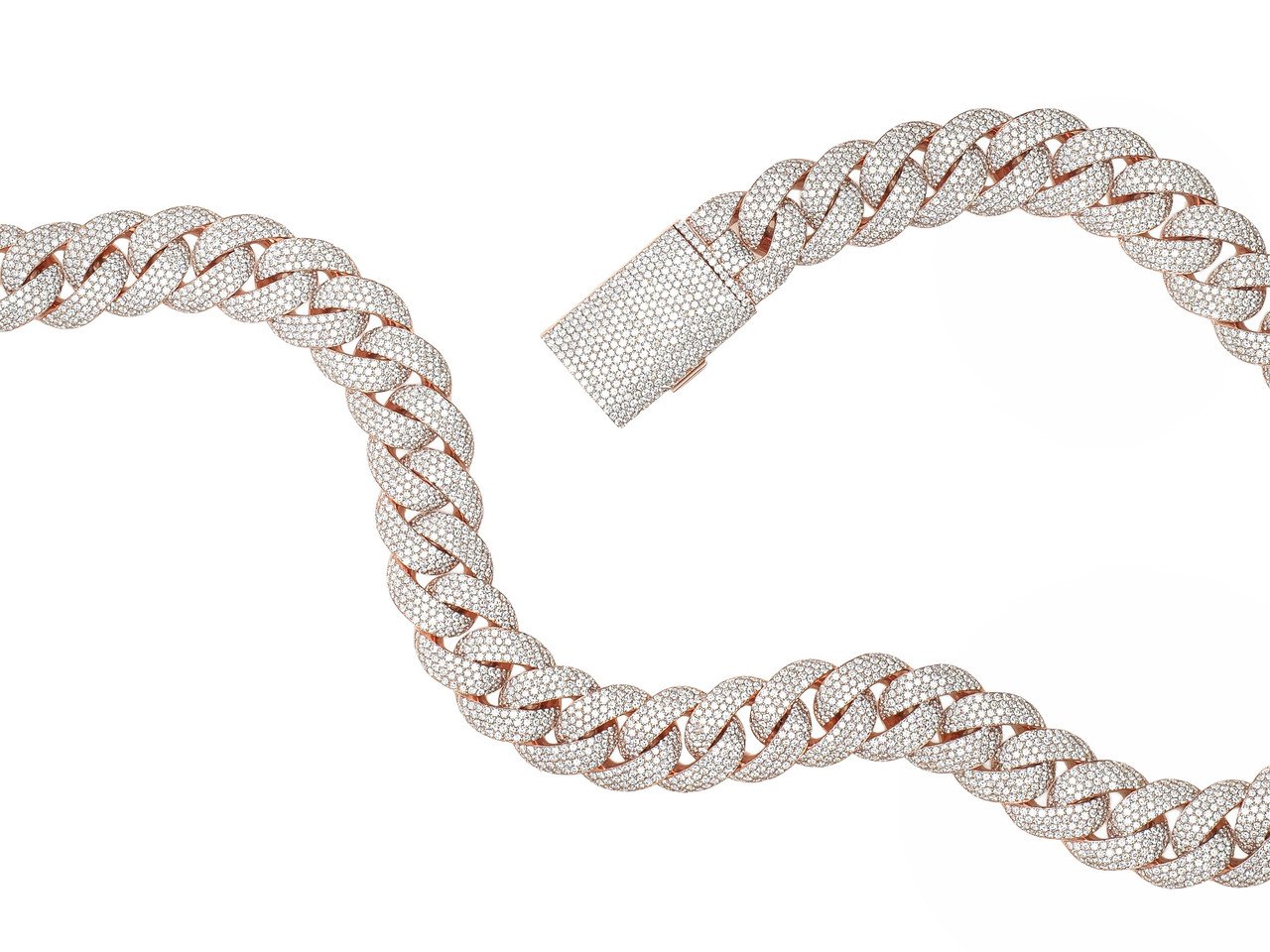 Make a striking statement with this 10K Rose Gold Cuban Chain Necklace, expertly crafted for luxury and presence. Featuring a total diamond weight of 59.53 carats and a substantial 400.32g weight, this necklace exudes brilliance and durability.
