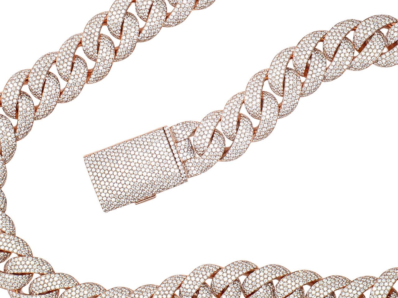 Bold and luxurious, this 10K rose gold Cuban chain necklace weighs 400.32g and features an impressive 59.53ctw of diamonds, making it a true statement piece.