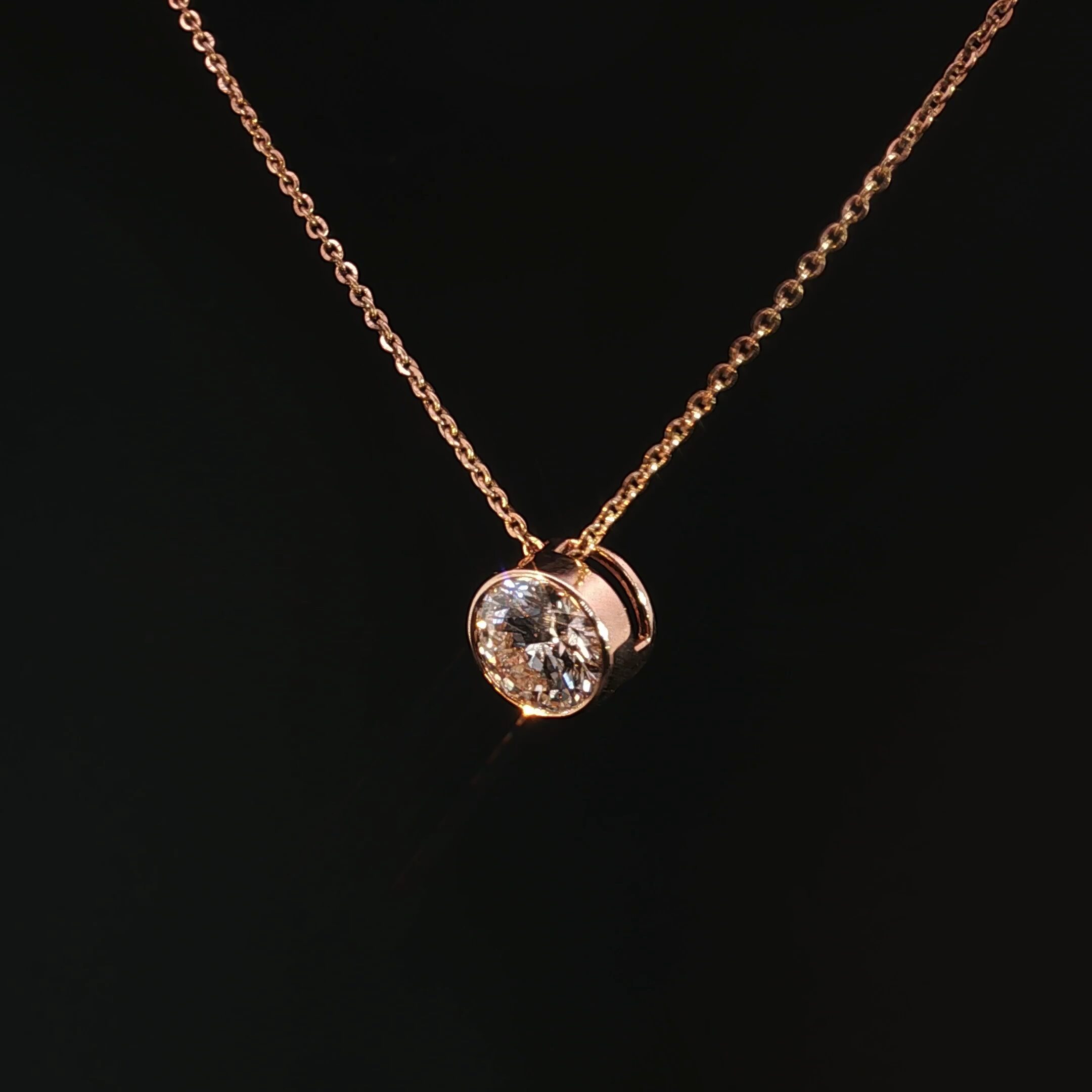 Crafted in solid 14K rose gold, the necklace offers a warm and romantic tone that complements the brilliance of the diamond. With a gold weight of 3.56 grams, it provides a comfortable and lightweight feel, perfect for everyday wear while still making a graceful statement. The centerpiece 2.12 carat round diamond adds impressive sparkle and elegance, making this necklace ideal for both casual styling and special occasions.