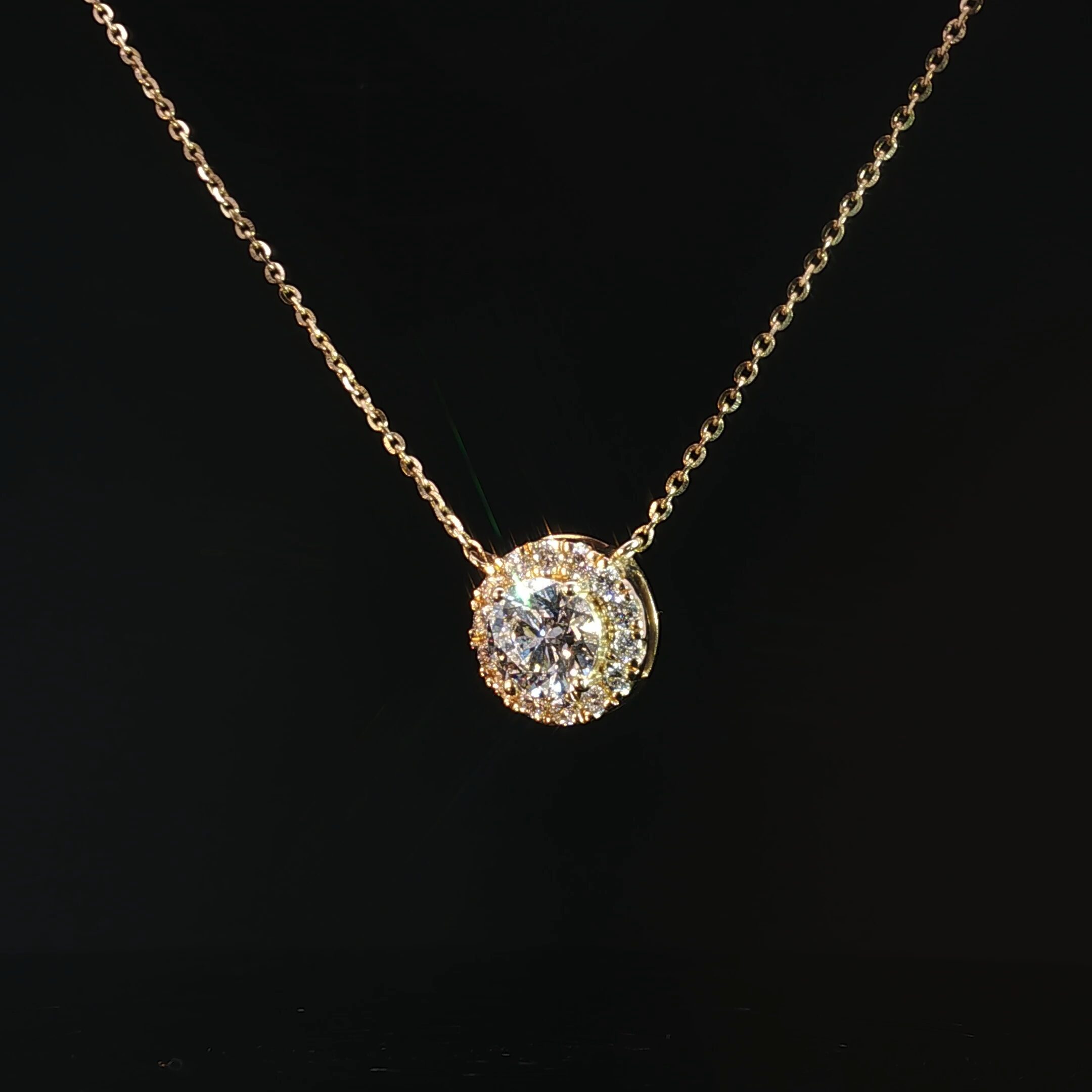The warm tone of 14K yellow gold beautifully complements the brilliance of the diamonds, giving the necklace a timeless yet modern look. The halo design not only adds extra sparkle but also highlights the stunning center stone, making it the perfect statement piece for any occasion.