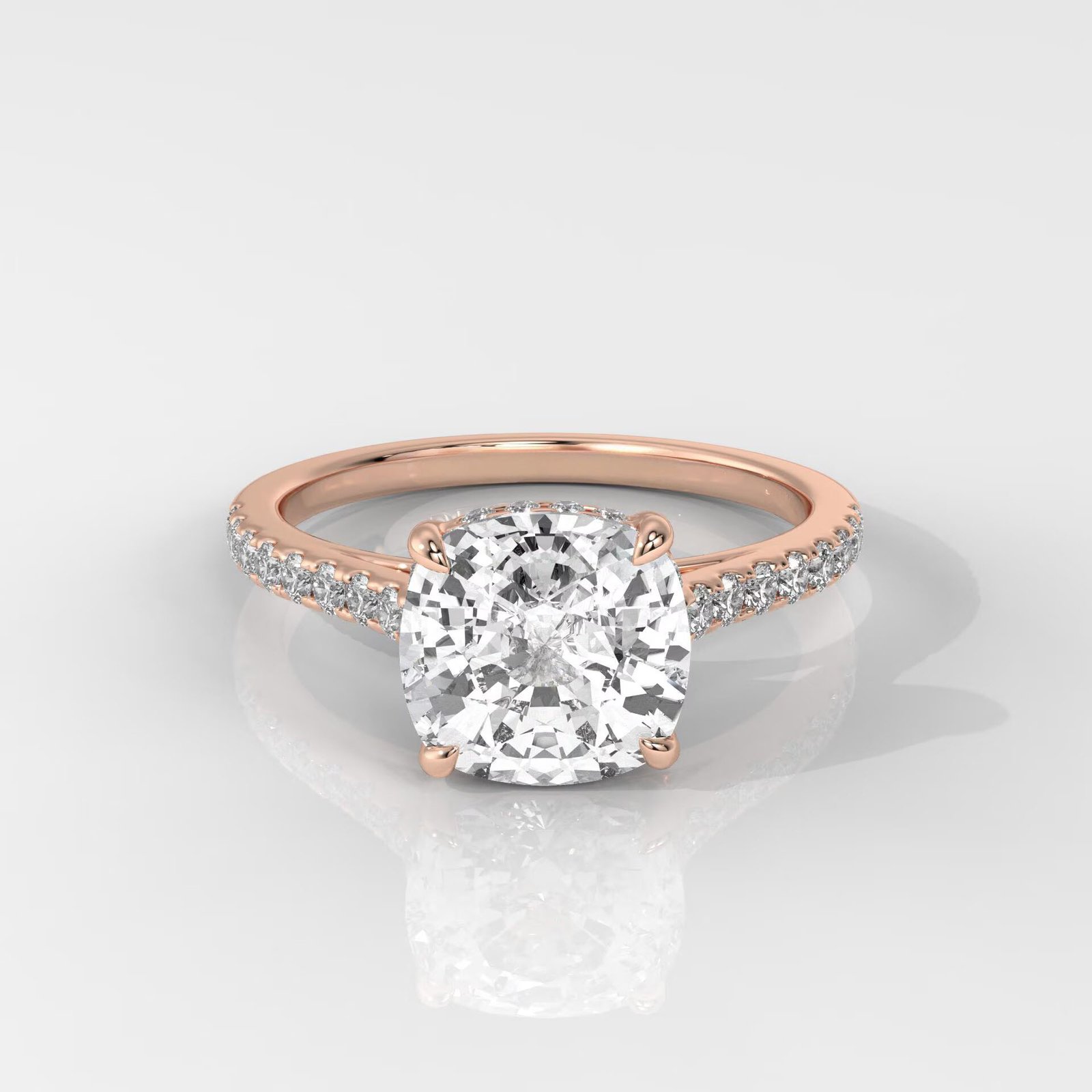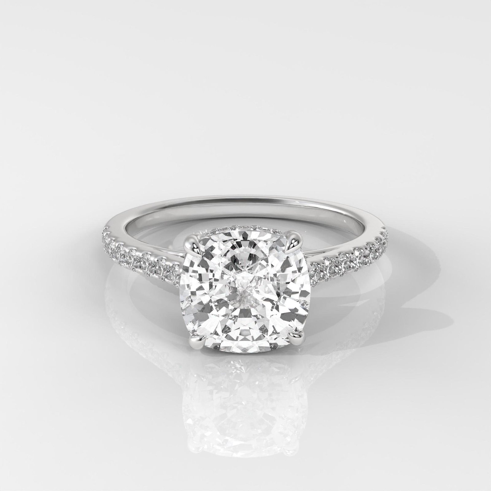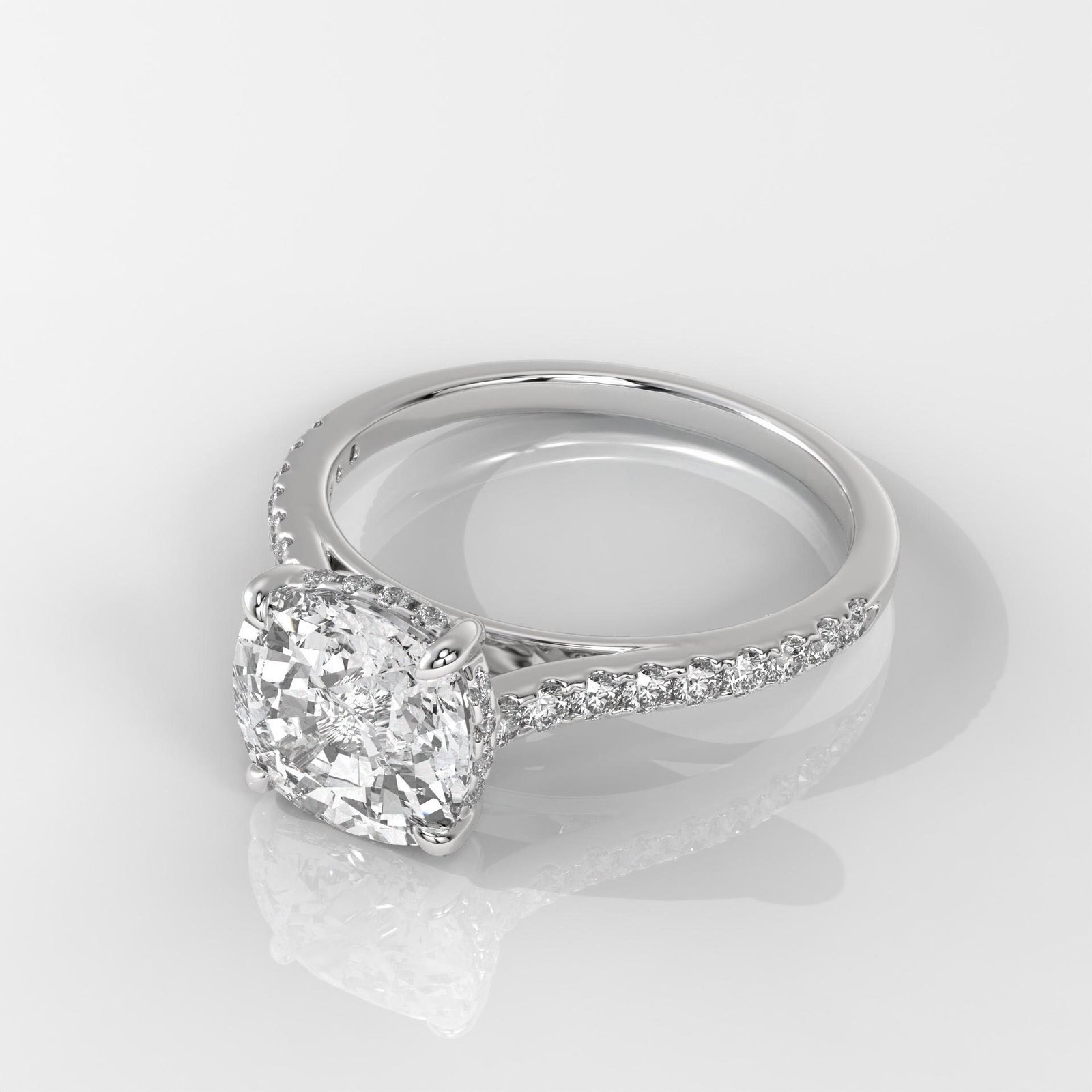 The cushion cut combines the brilliance of a round diamond with the soft, romantic outline of a square, making it a perfect blend of classic and modern. Enhanced with side stones, this engagement ring radiates elegance from every angle.