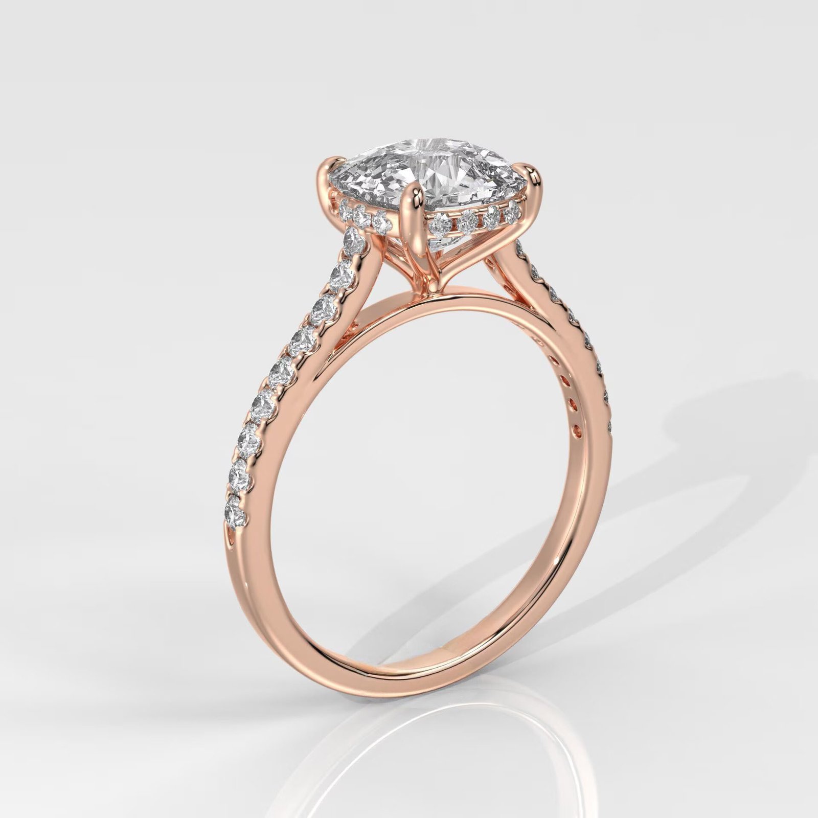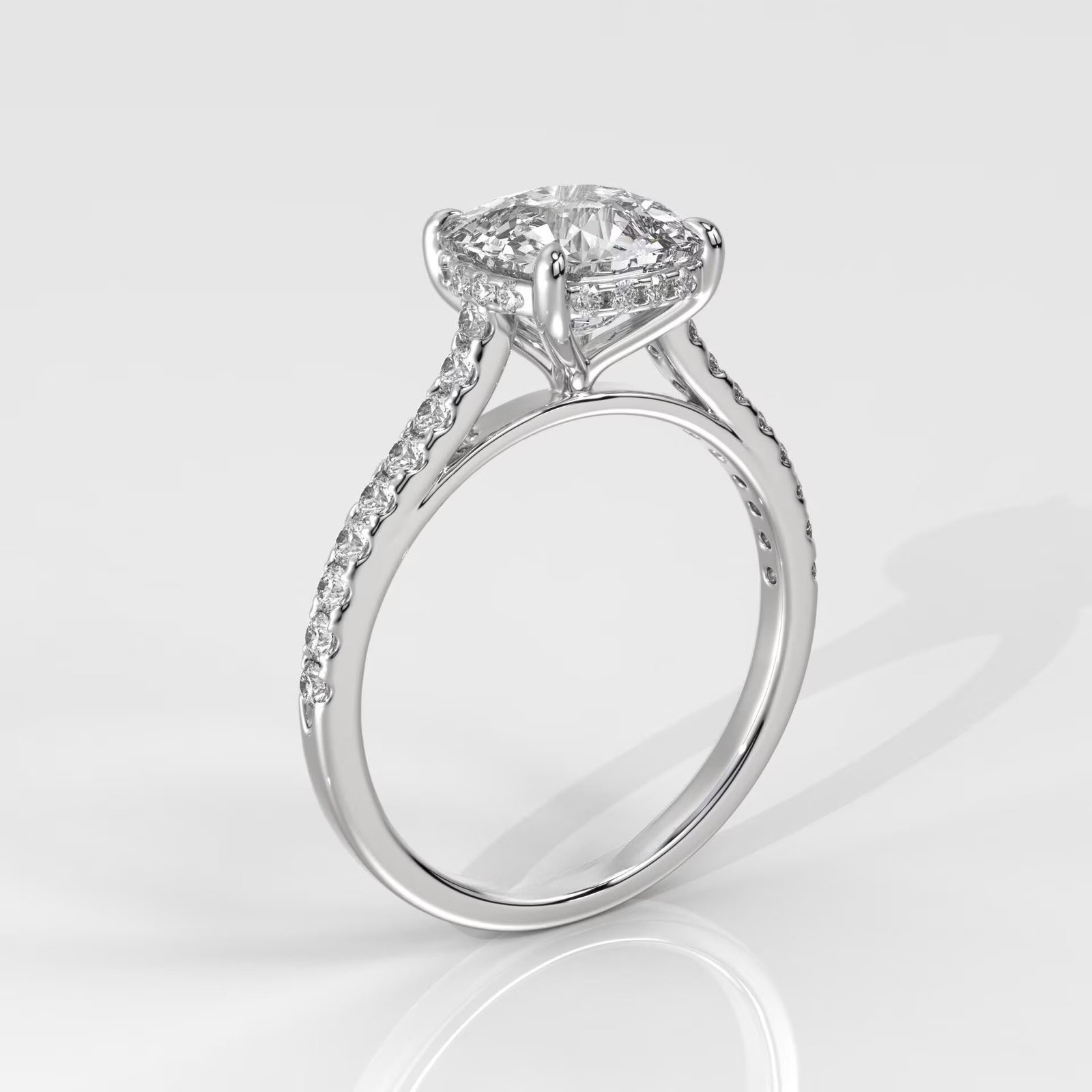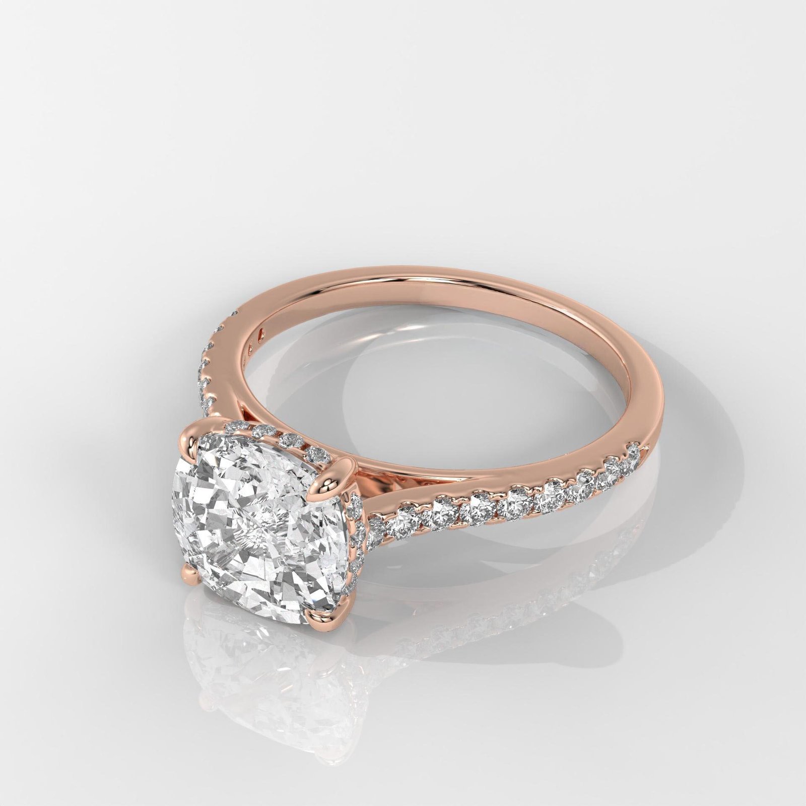 The cushion cut combines the brilliance of a round diamond with the soft, romantic outline of a square, making it a perfect blend of classic and modern. Enhanced with side stones, this engagement ring radiates elegance from every angle.