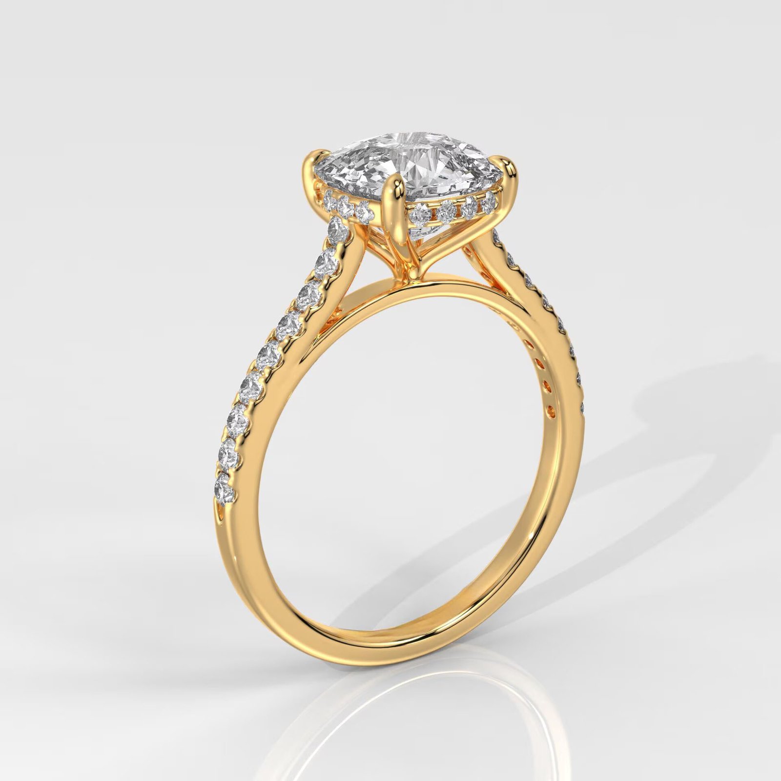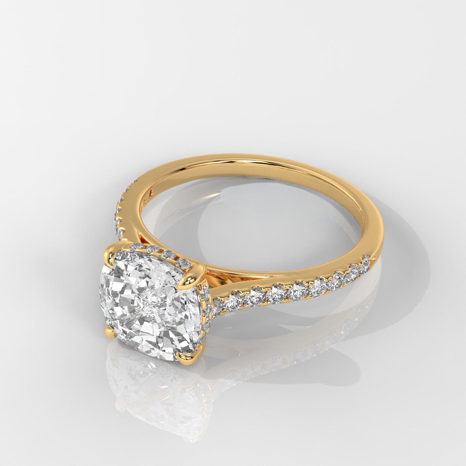 Celebrate everlasting love with this 14K Gold Cushion-Cut Diamond Engagement Ring, featuring an IGI-certified lab-grown diamond and a sparkling band of side stones for timeless brilliance.