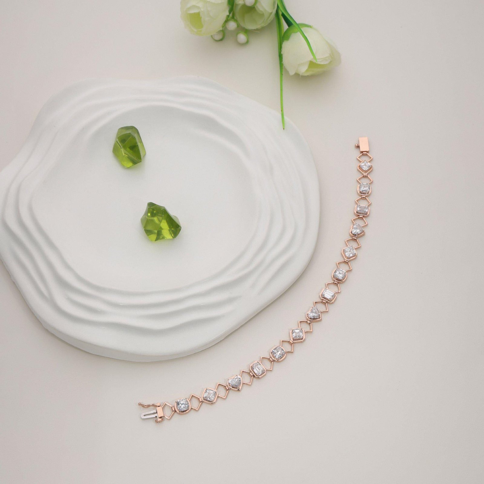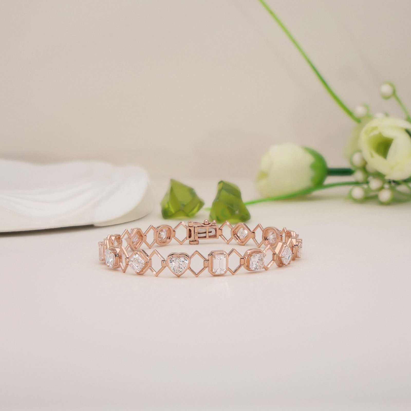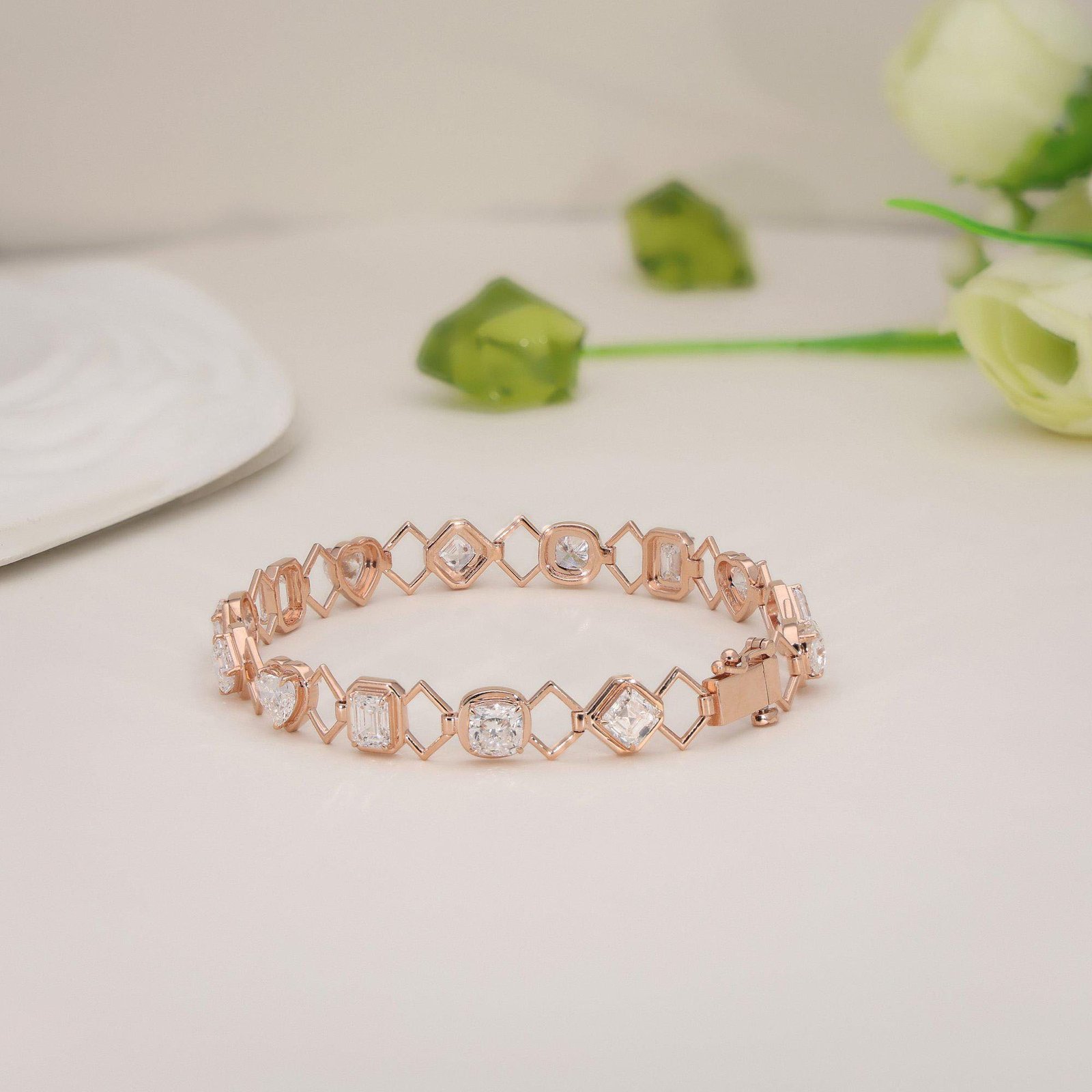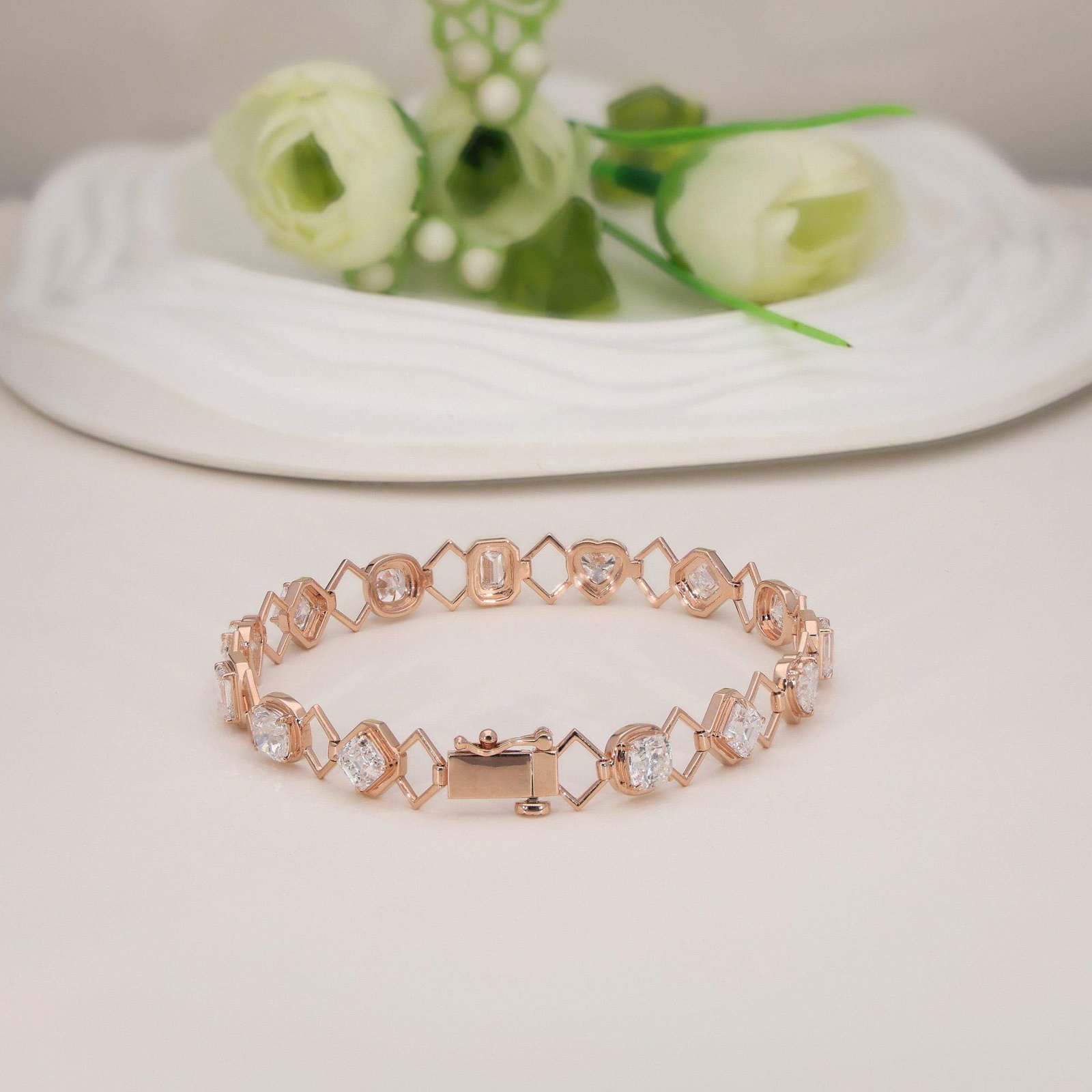 Elegant 14K Gold Multi-Shape Diamond Bracelet featuring Heart, Emerald, Asscher & Square Cushion Lab Grown Diamonds. DEF color, VVS–VS clarity. A timeless piece for modern women.