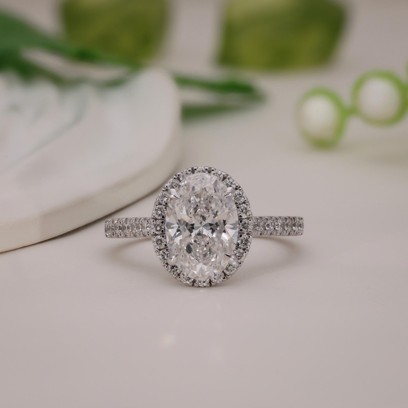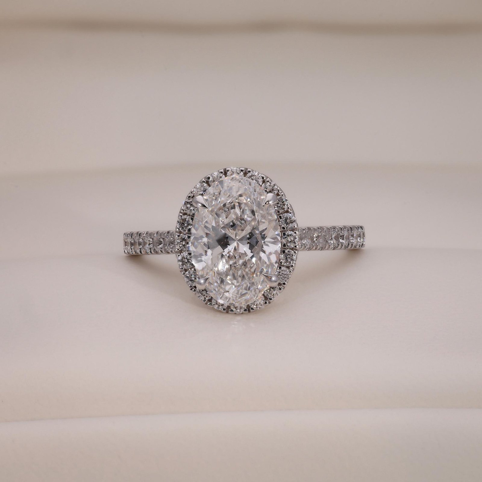 An elegant Oval-Cut Diamond Halo Ring by OTP Jewelry, featuring a certified lab-grown oval brilliant diamond set in white gold, surrounded by a sparkling halo and pavé diamond band. Customizable and made to order.