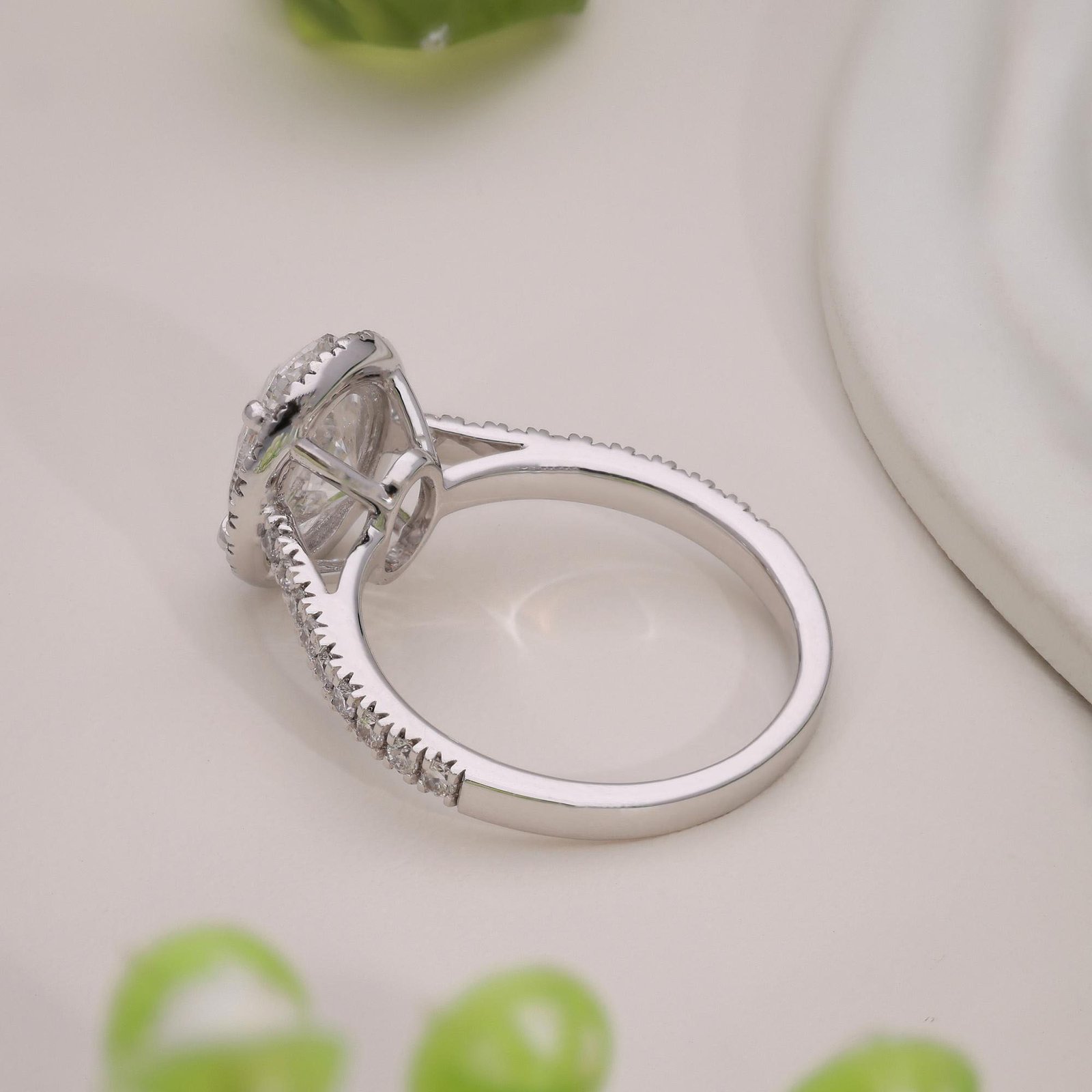 • Side Stones: Round Brilliant Diamonds (Halo + Pav? Band)