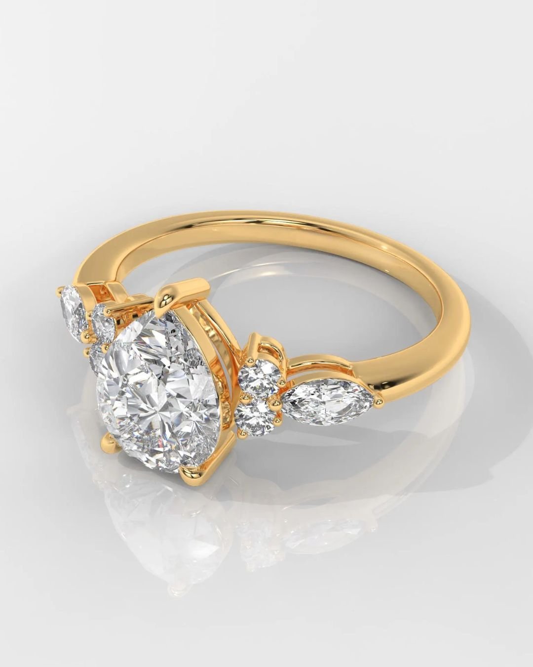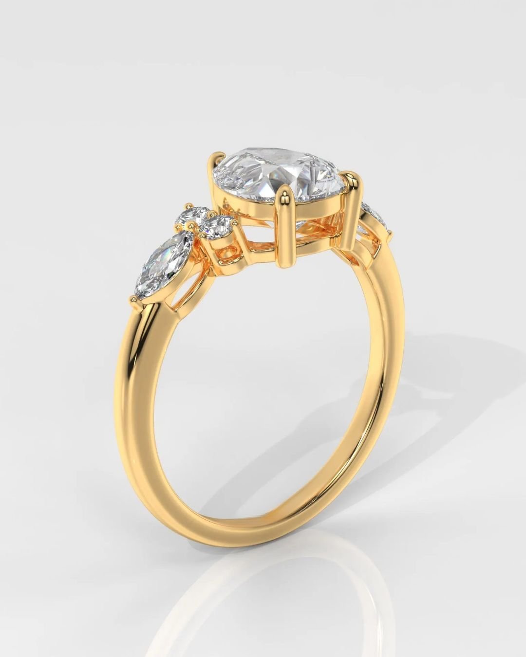 Featuring a stunning Pear Brilliant lab-grown diamond with Round & Marquise side stones, this 14K gold ring shines with DEF/VVS–VS quality and certified brilliance. A radiant symbol of love and elegance.