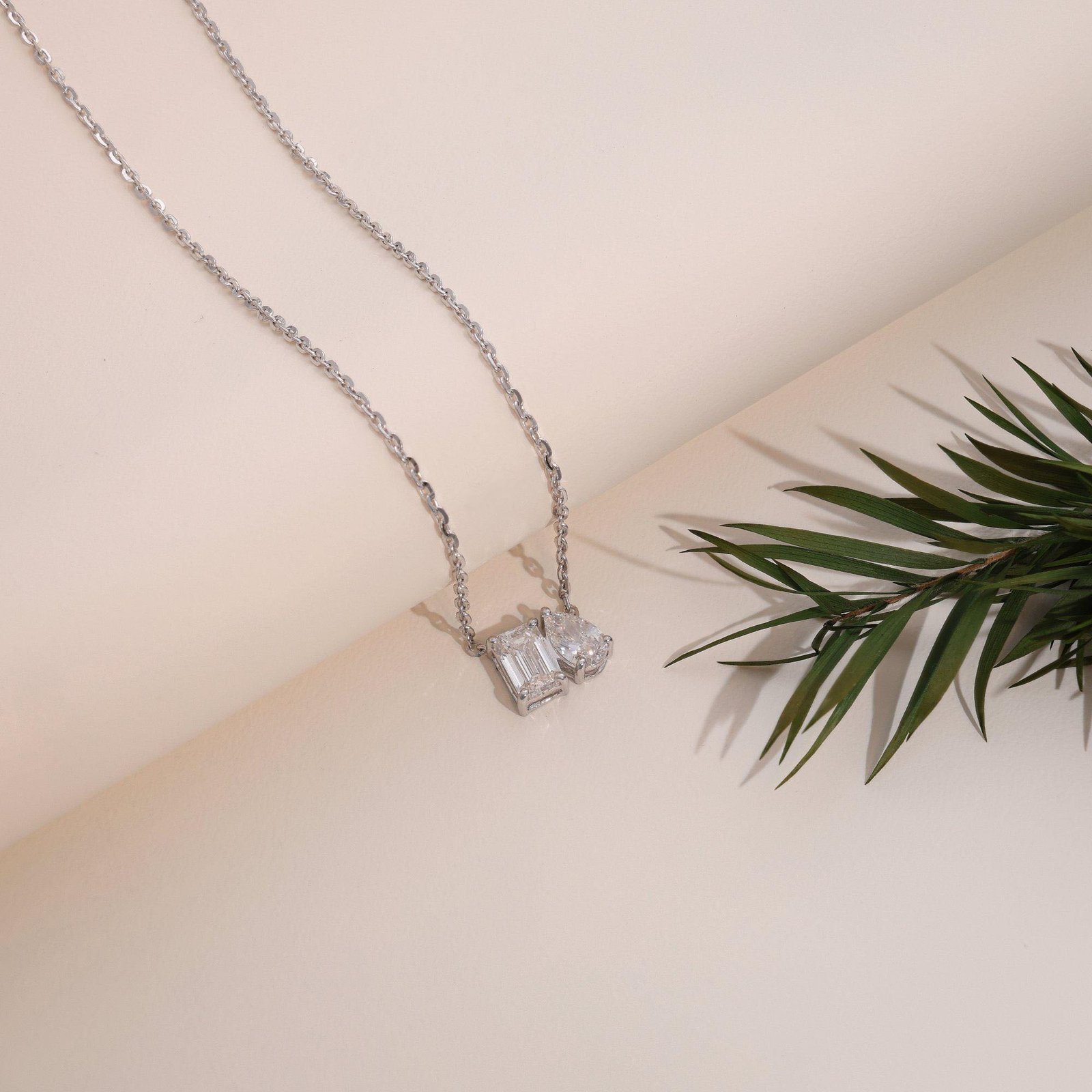 Elegant Toi et Moi Necklace featuring Pear & Emerald-Cut IGI Certified Lab Grown Diamonds in 14K White Gold. 2.2 CT Total Weight. Made to order with customizable diamond sizes and chain length.