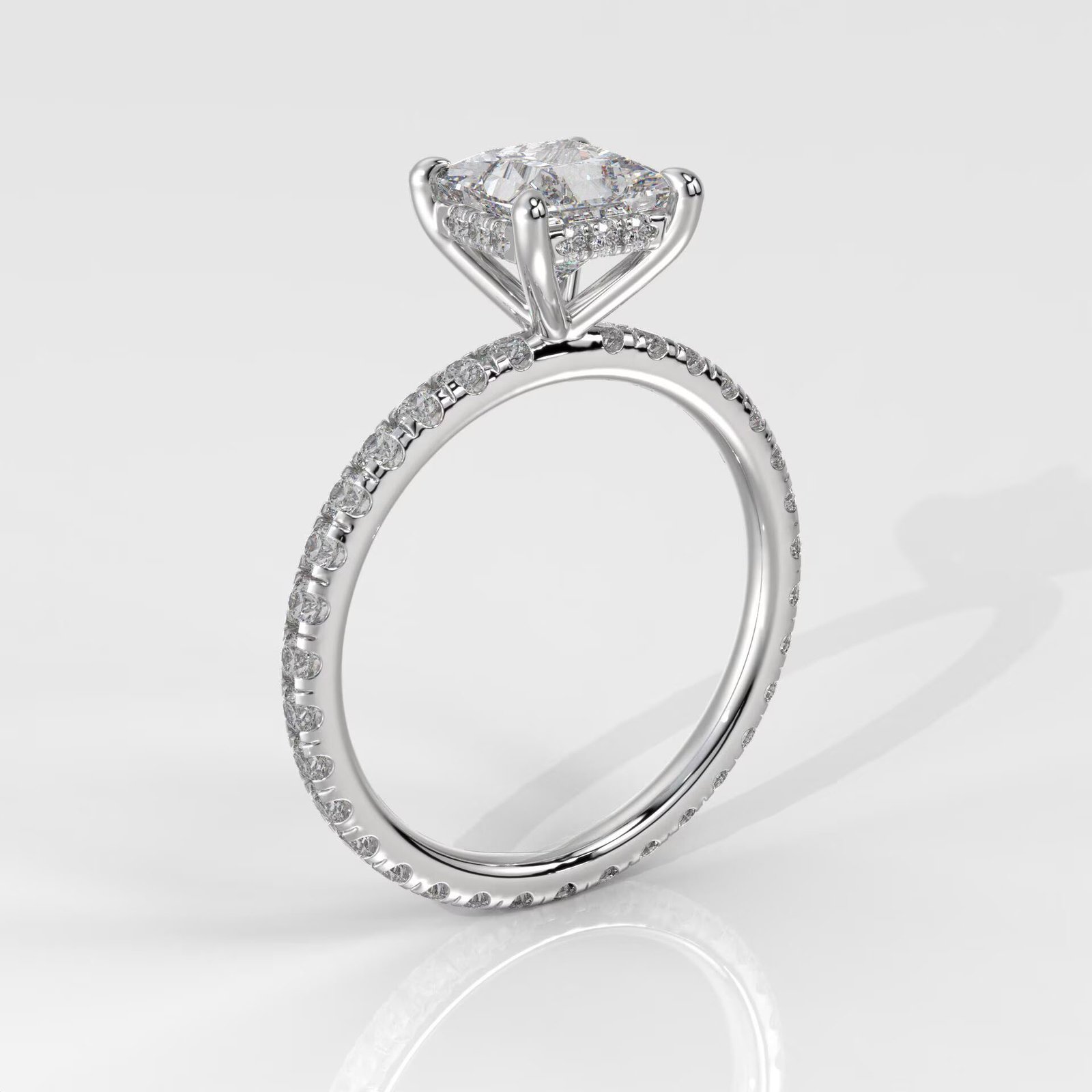 The hidden halo a delicate ring of diamonds tucked just beneath the center stone adds a touch of sparkle from every angle, creating a beautiful surprise that enhances the brilliance without overpowering the sleek silhouette. Side stones totaling 0.75 carats, all DEF color and VVS–VS clarity, complete the look with refined sparkle.