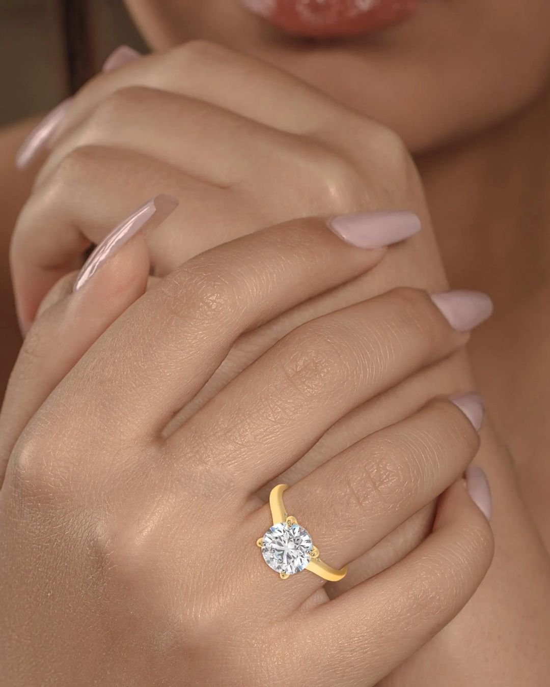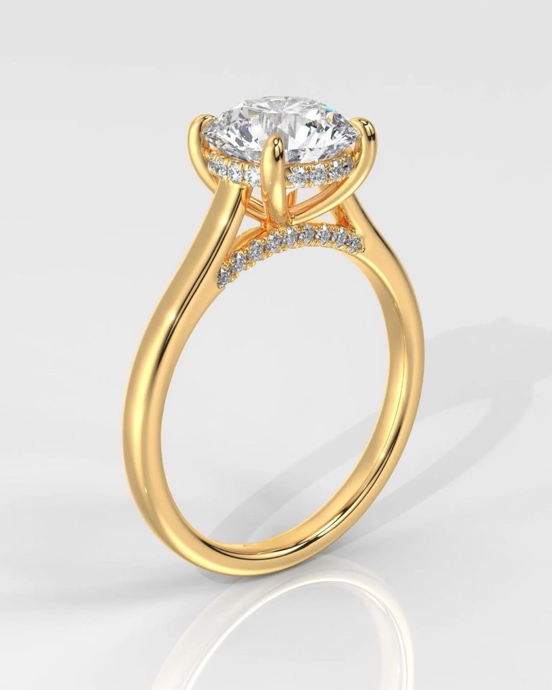 A timeless 14K gold engagement ring featuring a Round Brilliant IGI certified lab grown diamond with a hidden halo and accented band. Ethically crafted and fully customizable, this ring shines with DEF color and VVS–VS clarity.