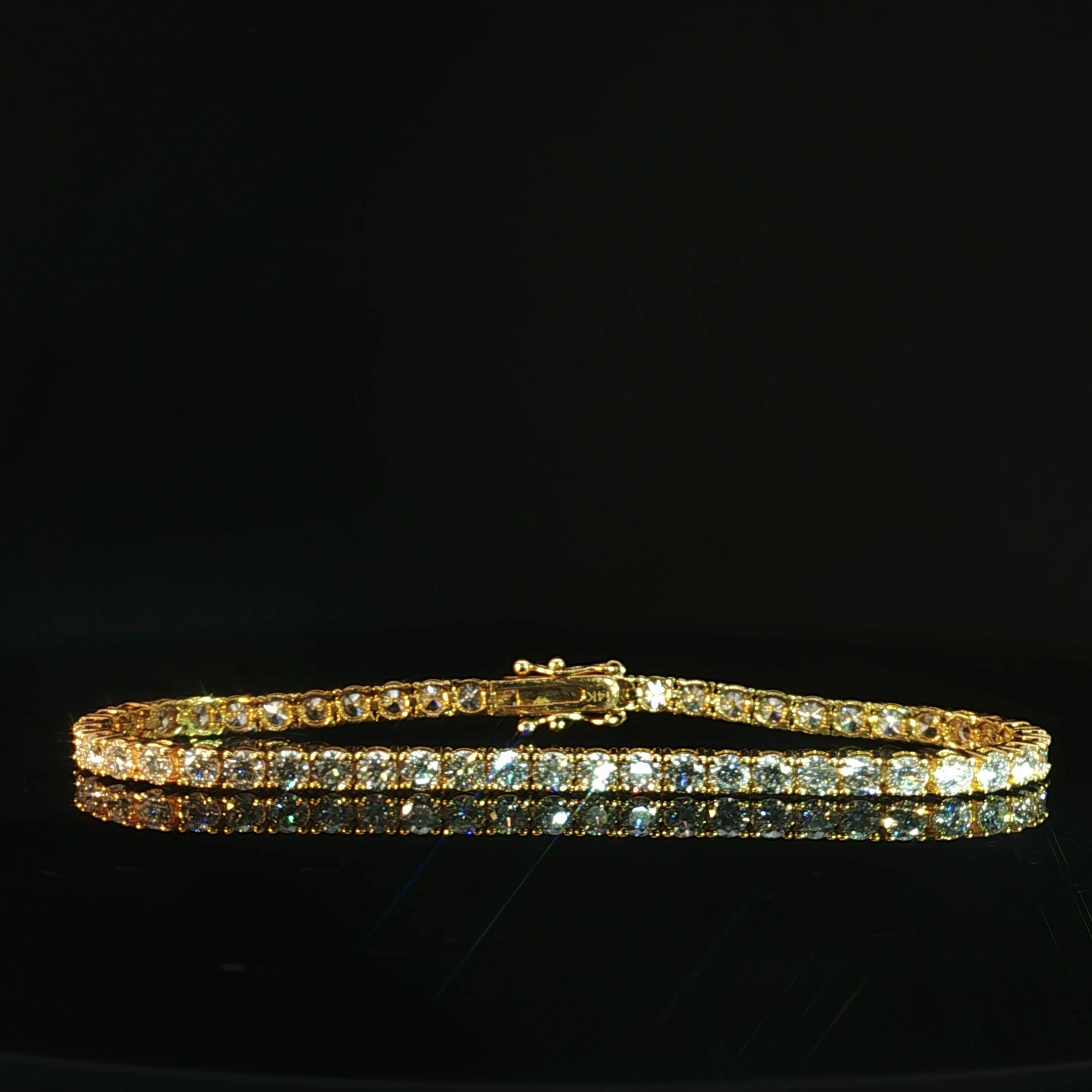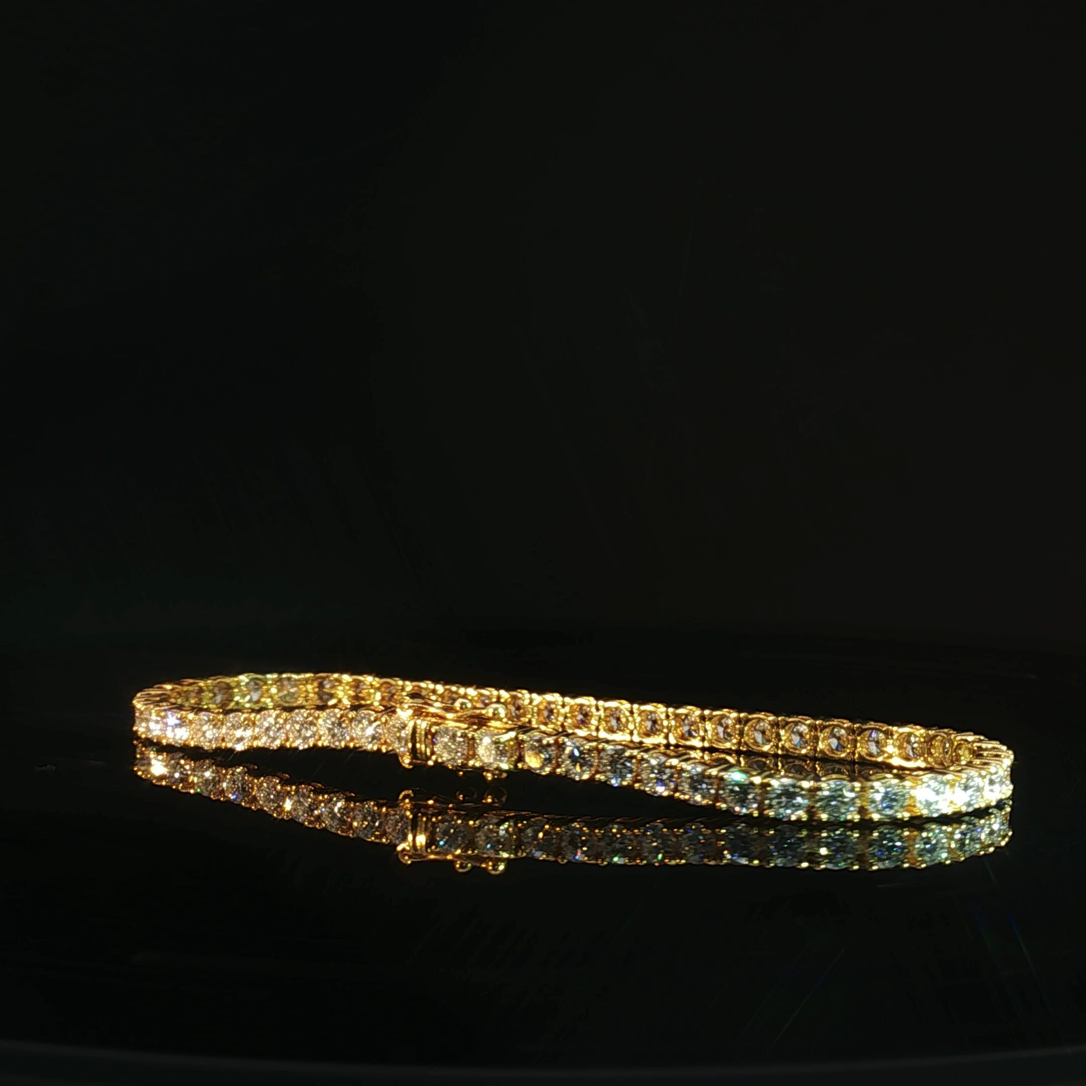 Crafted in solid 14K yellow gold, this bracelet has a gold weight of 8.62 grams, offering a perfect balance of durability and comfort. With an impressive total diamond weight of 6.34 carats, the classic tennis design delivers exceptional sparkle while maintaining an elegant and wearable profile for both everyday use and special occasions.