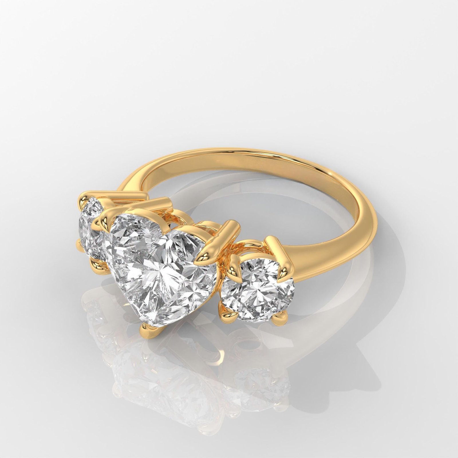 Declare your love with this romantic 14K Gold Heart-Shaped Three-Stone Diamond Ring, showcasing a dazzling IGI-certified lab-grown center diamond flanked by two brilliant side stones. A timeless expression of love, balance, and elegance.