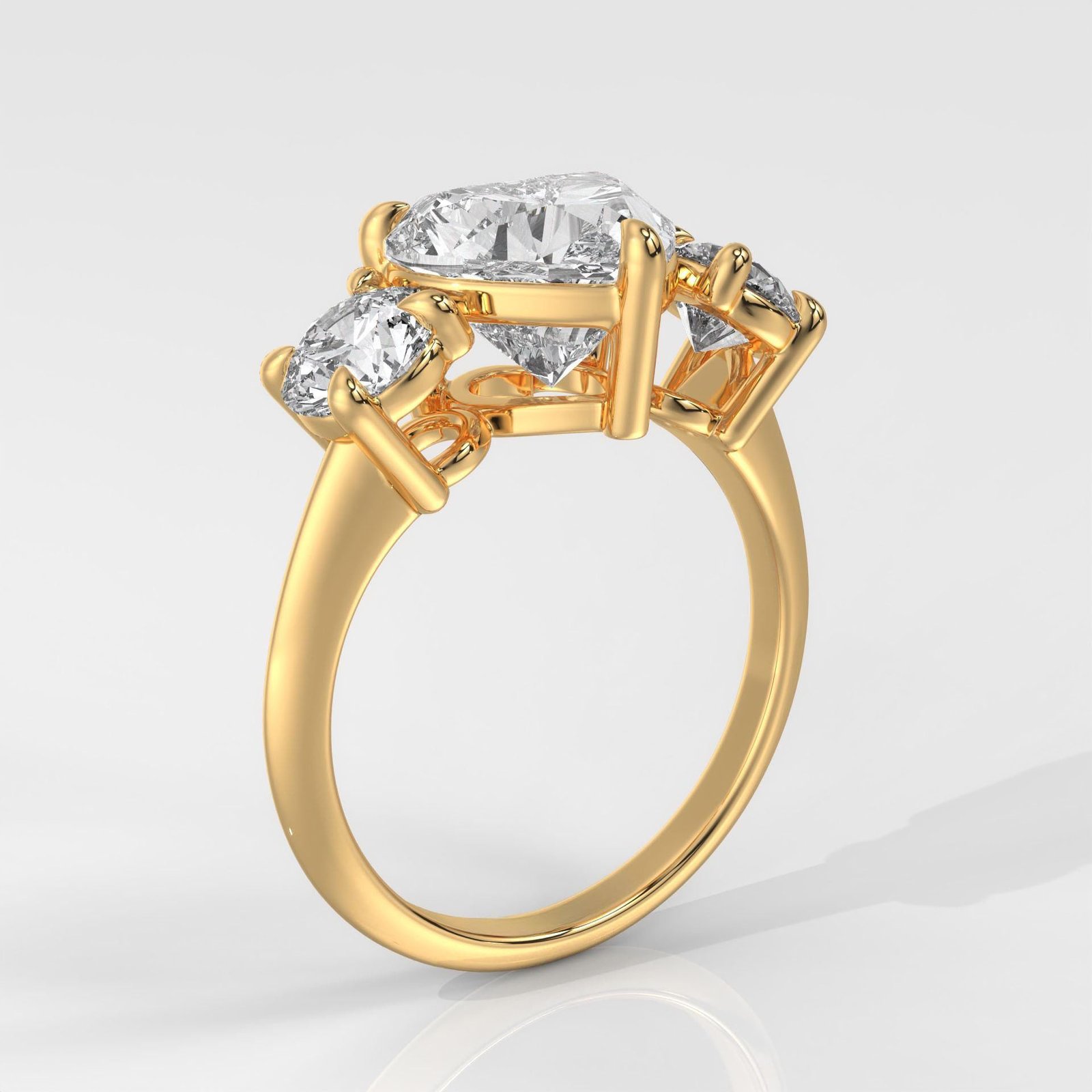 Celebrate love in its truest form with our 14K Gold Heart-Shaped Three-Stone Diamond Ring ? a stunning piece that captures the essence of romance, unity, and enduring commitment. At the heart of this elegant design lies a brilliant IGI-certified lab-grown heart-cut diamond, perfectly framed by two round side stones that symbolize your past, present, and future together.